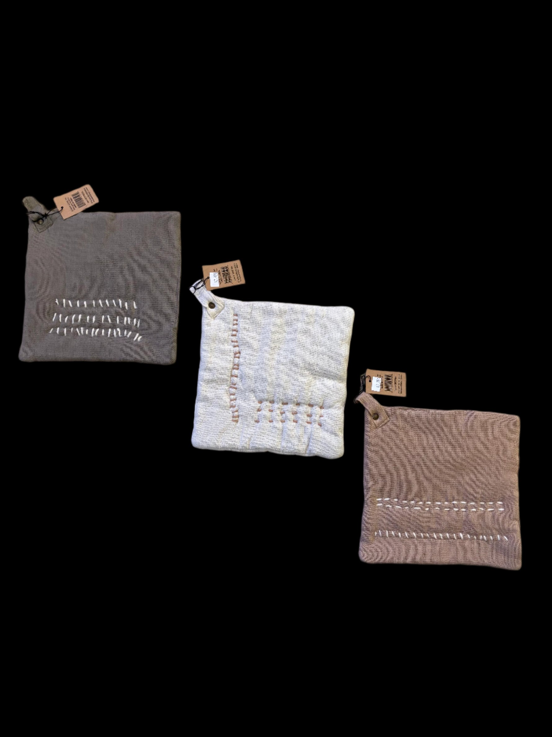 Precio unitario / porAdd a touch of charm and functionality to your kitchen with our 8" Square Cotton Slub Pot Holder. Expertly crafted in a timeless country-bohemian style, it boasts a hand-stitched design on the front, adding a unique, artisanal flair to your cooking essentials. Made from durable cotton fabric, it offers excellent heat resistance to protect your hands during meal prep. Available in three versatile colors—cream, dusty rose, and grey—it effortlessly complements any kitchen décor. Whether you're pulling a tray of cookies from the oven or carrying hot dishes to the table, this pot holder combines style and practicality to elevate your everyday cooking experience.