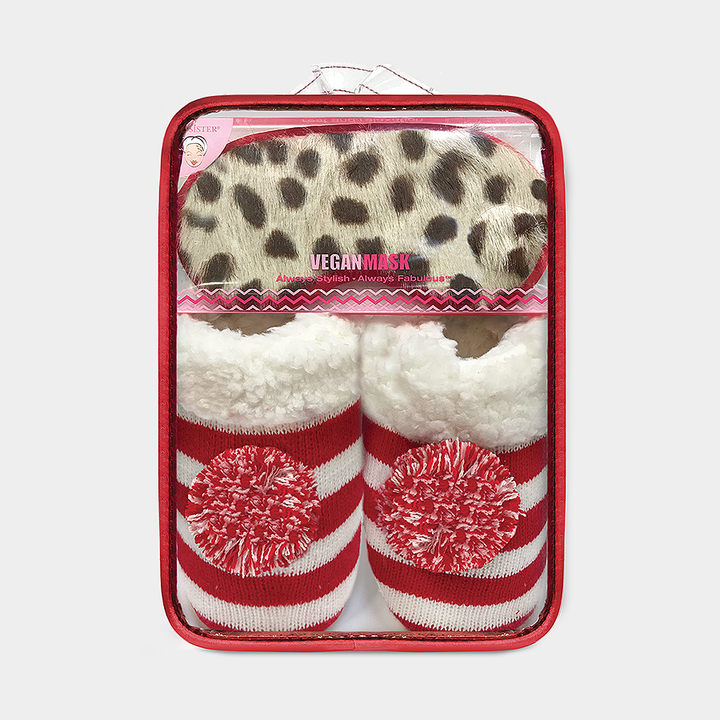 Ponte unas mullidas pantuflas navideñas con pompones y una mascarilla para dormir 100% vegana para pasar una noche relajante en casa.