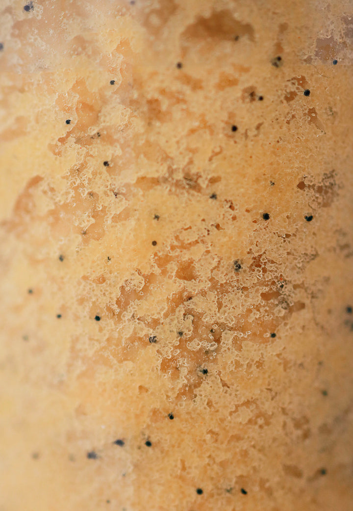 Ingredientes: Azúcar de caña, aceite de almendras dulces, aceite de girasol, manteca de karité, aceite de aguacate, mantequilla de mango, cera emulsionante, ácido esteárico, aceite de jojoba, aceite de argán, leche de cabra deshidratada, miel en polvo, vitamina E, conservante (fenoxietanol, caprililglicol), rosa mosqueta Aceite de semilla, semillas de amapola, perlas de jojoba, arcilla brasileña amarilla, aceite de fragancia sin ftalatos.
