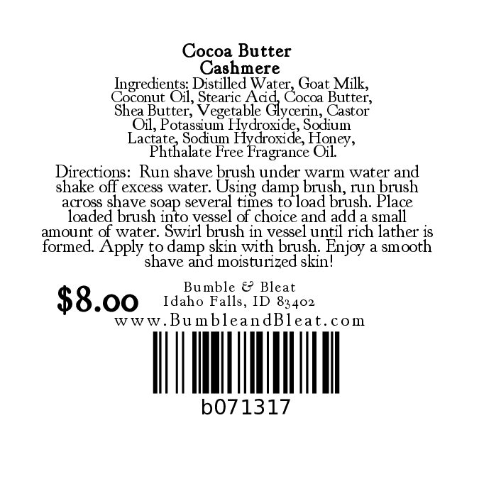 Ingredients: Distilled Water, Goat Milk, Coconut Oil, Stearic Acid, Cocoa Butter, Shea Butter, Vegetable Glycerin, Castor Oil, Potassium Hydroxide, Sodium Lactate, Sodium Hydroxide, Honey, Phthalate Free Fragrance Oil