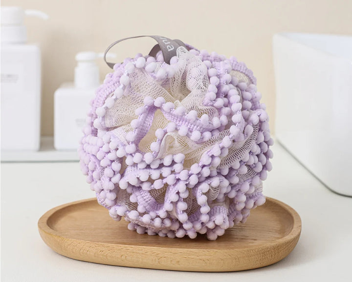 Revel in the everyday luxury of bathing with our Elegant Bath Loofah Pouf with Pom Pom Trim – the perfect addition to any pampering routine.