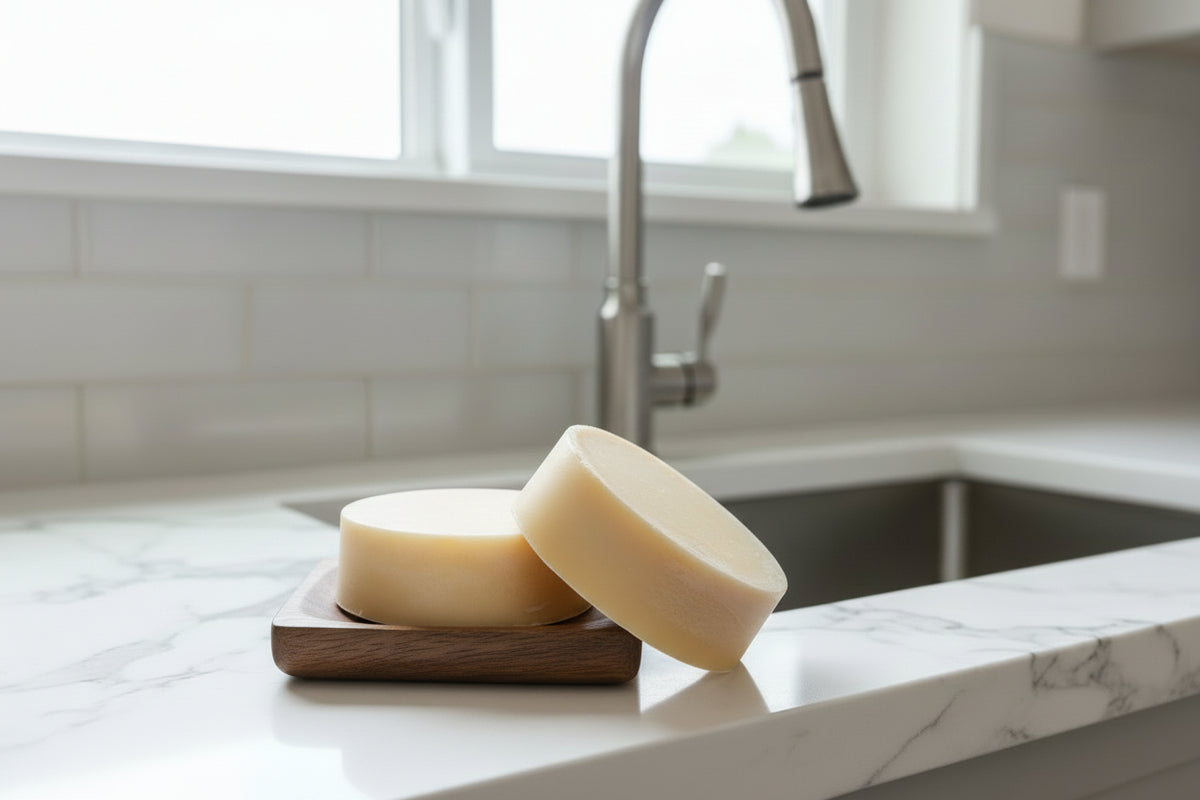 Solid dish soap eliminates plastic bottles, lasts longer, and avoids unnecessary fillers — offering concentrated cleaning power in a simple, intentional form.